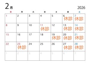 2026年2月 2月のお知らせ 2026.2.1 お知らせ ①休診日について 2月 11日(水)休診 18日(木)臨時休診 23日(月)休診 ②アンケート 猫ちゃんの予防薬について、アンケート実施中です! ぜひご協力をよろしくお願いいたします。 Read More >> LATEST POST最近の投稿 2月のお知らせ 2026年1月のお知らせ 11月のお知らせ CATEGORYカテゴリ お知らせ (111) ブログ (0) ARCHIVEアーカイブ 2026年2月 (1) 2026年1月 (1) 2025年11月 (5) 2025年10月 (1) 2025年9月 (1) 2025年8月 (1)
